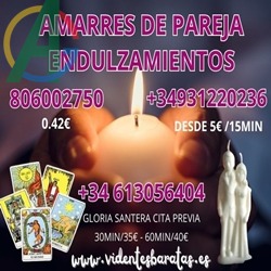 hola soy gloria santera, vidente espiritista sanadora, doy respuestas claras, tiempos de videncia a corto plazo, con fechas aproximadas, vidente espanola, vidente con aciertos de un 95% por ciento aproximadamente. 100% confidencial. para consultar con gloria santera, me teneis que pedir cita por whatsapp, al +34 613056404 mi tarifa es 30min/35€ y 60min/35€.soy especialistas en romper todo tipo de brujerias negativas, ¿si tienes un bloqueo y no levantas cabeza? ¿es por algo? llamame y lo miramos. si quieres un tarot mas barato, te puedes consultar con mis companeras a este telefono 918371378 tienes tarifas desde 4€/17mi
