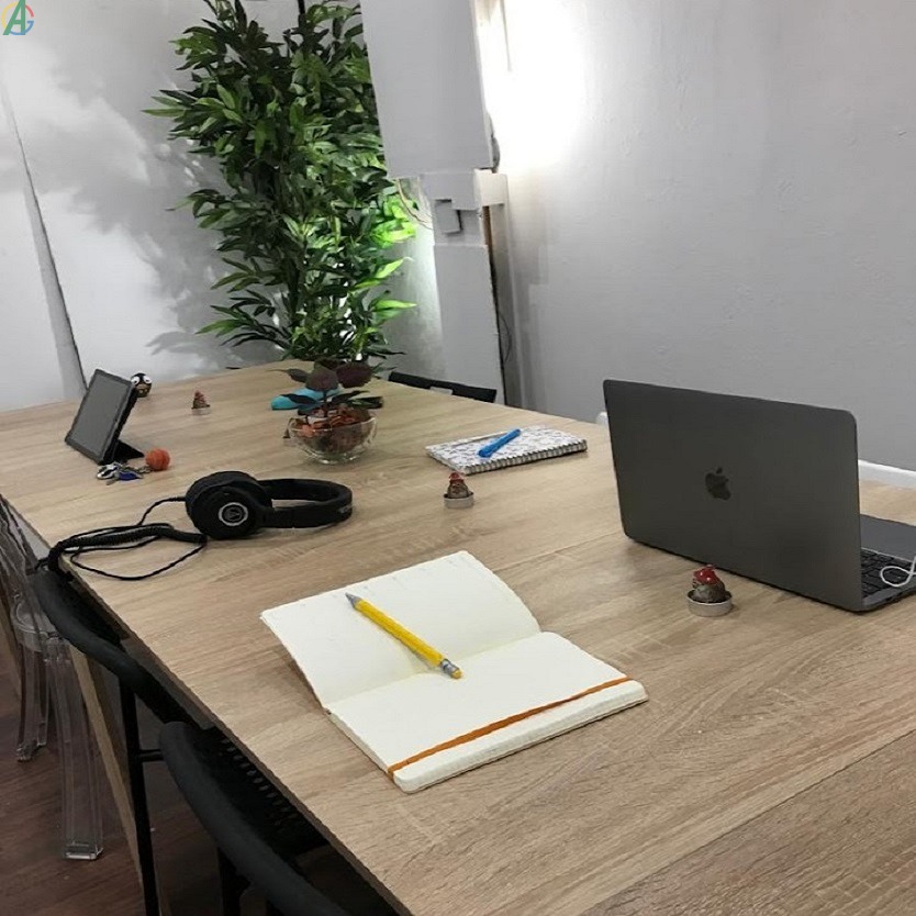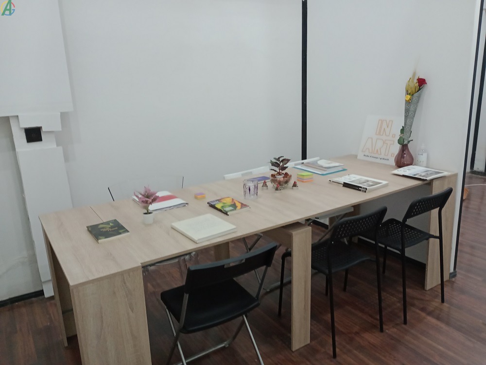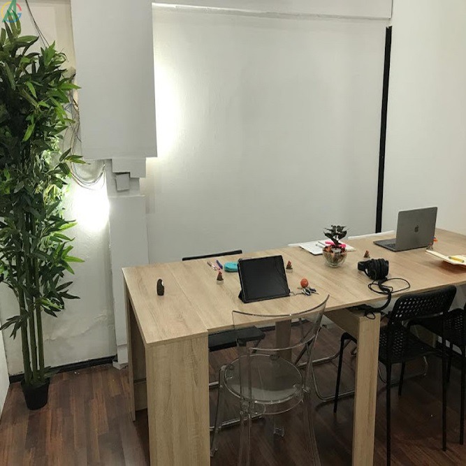 Alquiler de sala para despacho o reuniones de trabajo (workshop). Capacidad: 8 a 12 persona, superficie de 25 m2, wifi, mesa y sillas, sofá, autoservicio de te y café. Disponibilidad de proyector bajo petición.