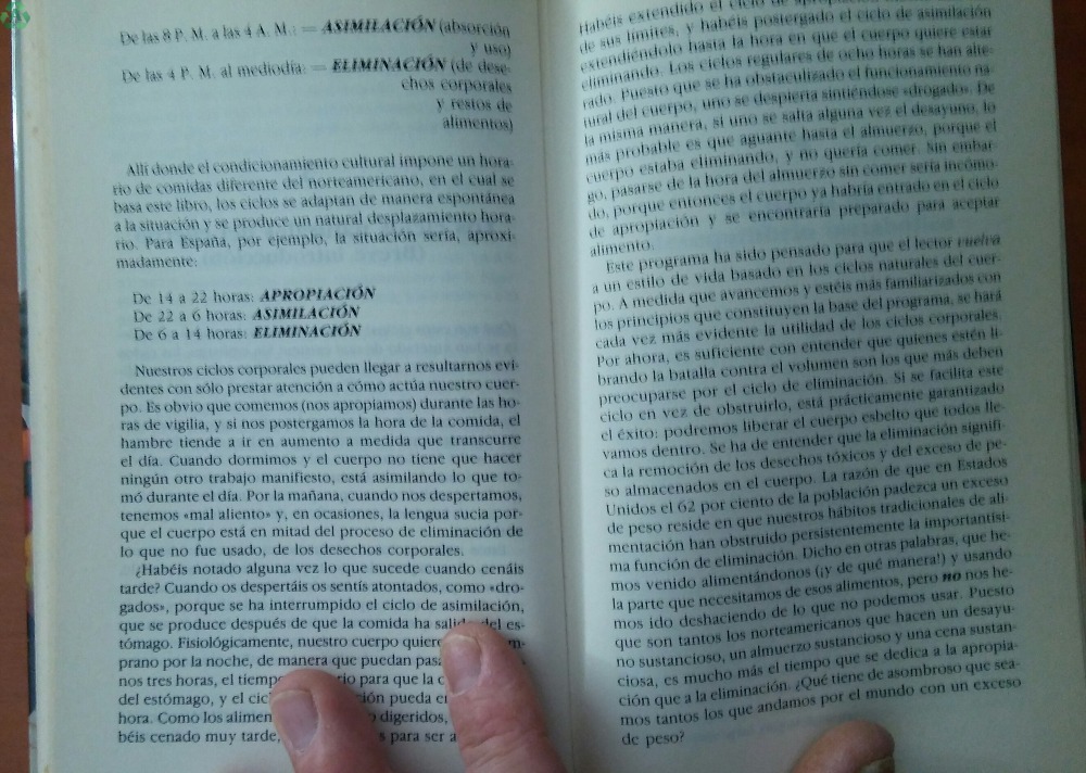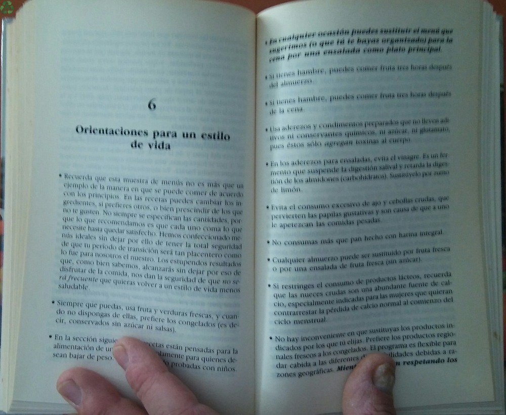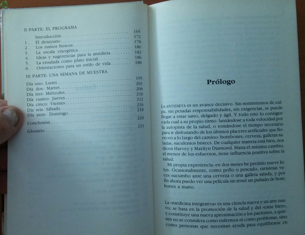 Libro que trata sobre la alimentación y el hábito alimenticio correcto, para seguir toda la vida, por Harvey y Marilyn Diamond, de Ediciones Urano, para Circulo de Lectores, edición 1986, con tapas duras, formato 21,5 x 13,5. Libro de 232 páginas. Guía completa para alimentarse bien, tener buena salud y una silueta esbelta. Libro claro y sensato sobre cómo debemos alimentarnos. Lo importante, no es qué se come, sino cómo y cuándo se come. Con los principios de LA ANTIDIETA, su alimentación se ajustará al ritmo de su organismo, permitiendo que sus mecanismos de autodepuración y auto-mantenimiento produzcan óptimos resultados. Conseguirá más salud, más energía y el peso ideal en forma permanente. No le propone un programa para unas semanas, sino una nueva manera de enfocar la alimentación, una forma de comer, que le llenará de salud y energía, y en su peso ideal. Da unas pautas saludables y le ayuda a entender, cómo funciona su cuerpo a la hora de digerir los alimentos. ENVÍO GRATIS y embalaje protegido