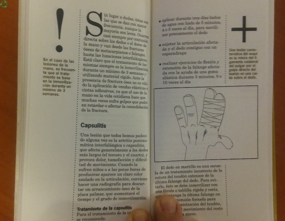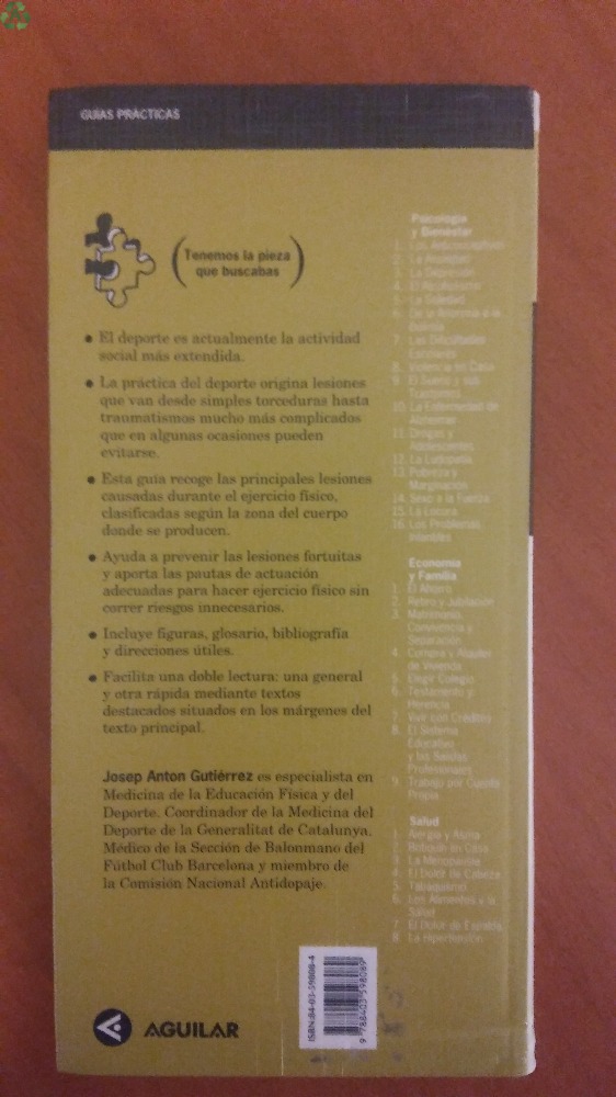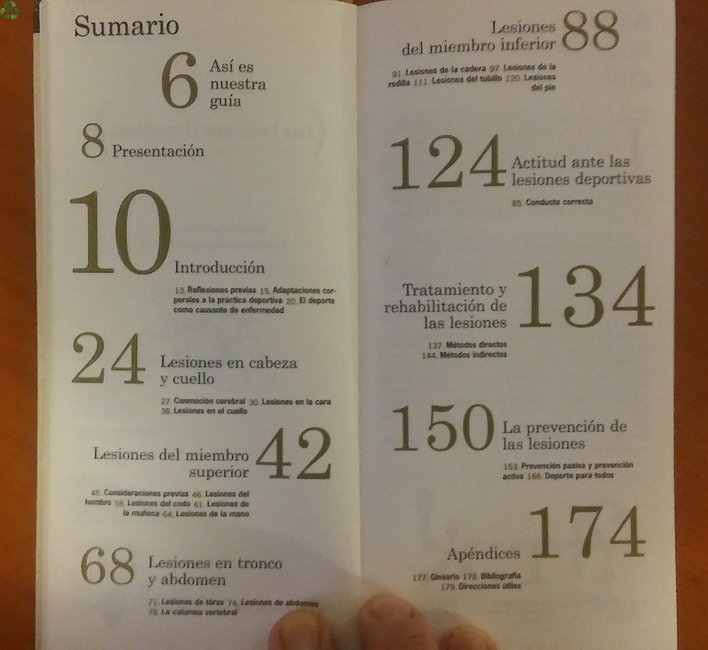 Libro muy claro, redactado por Josep Antón Gutiérrez, de Editorial Aguilar, edición 1997, pasta dura. Libro de 190 páginas, con fotos. Una guía práctica, clara y objetiva, sobre las lesiones, con ejemplos reales, que analiza todos los posibles problemas que se pueden plantear, cuáles son sus soluciones, cuándo hay que acudir al profesional, y todo sin tecnicismos, con un lenguaje fácil de entender, ágil, directo. Lesiones en la cabeza y cuello. Lesiones del miembro superior. Lesiones del tronco y abdomen. Lesiones del miembro inferior. Actitud ante las lesiones deportivas. Tratamiento y rehabilitación de las lesiones. Prevención de lesiones. ENVÍO GRATIS y embalaje protegido