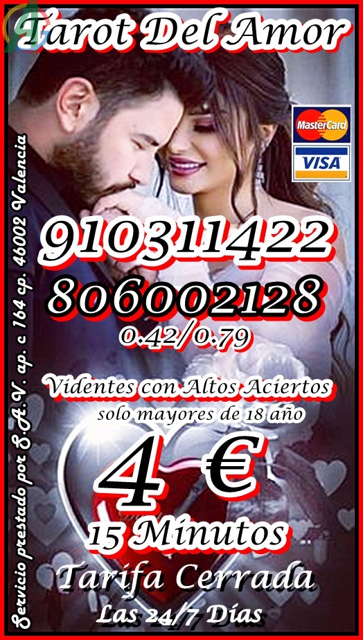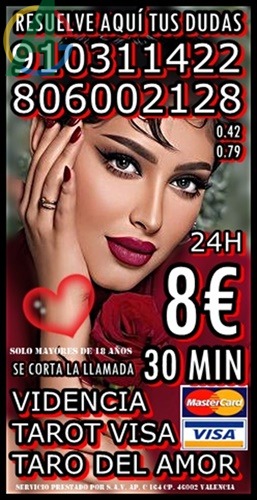 tarot telefonico 2026 Espana 4 euros 15 minutos tarifa cerrada TAROT CON VISA CERRADA /TAROT DEL AMOR /VIDENCIA 910311422 VISA desde 4€ 15 min/ 6€ 20min/ 8€ 30min//10€ 40min /15€ 55min / 17€ 70min/ 20€ 90min...806002128 desde Coste min. 0, 42/0, 79 cm € min red fija/movil. Soy vidente profesional Fechas. Te garantizo una consulta de alta calidad, dejame decirte lo que vendra a tu vida, con tan solo oir tu voz Alta experiencia en tarot del amor , de Pareja , Amistad , tambien en temas Laborales, Familiares, Economicos… videntes psiquicas expertas Servicio prestado por S.A.V. ap. c 164 cp. 46002 Valencia. Solo mayores de 18 anos. Llamada a telefono sin coste adicional. Visa 910 311 422 / 806 002 128 desde Coste min. 0, 42/0, 79 cm € min red fija/movil. Videncia, Tarot, Tirada del Amor, rituales, pendulo, Numerologia, Runas, suenos.